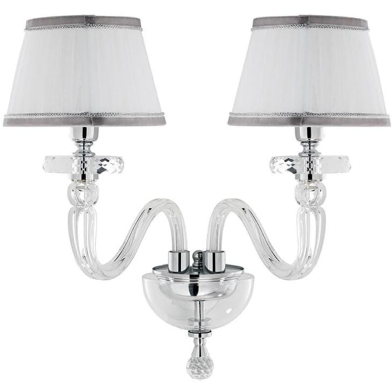 Lampada da parete BACH realizzata in vetro trasparente lavorato a mano con dettagli in metallo. Paralume in tessuto. Questa lampada moderna puo' adattarsi in modo unico e originale in ogni ambiente di casa per esempio nel soggiorno, salone o camera da letto. CARATTERISTICHE Colore: Cromo Materiale: Vetro, metallo Tipologia: Applique Modello: 2 luci con Paralume Materiale: Vetro, metallo Altezza: 36 cm Lrghezza: 38 cm Sporgenza: 20 cm Materiale paralume: Tessuto Diametro paralume: 16 cm Dimmerabile: NO Illuminazione: 2 x E14 (L'attacco E14 permette di installare lampadine a LED, fluorescenti o alogene non incluse). Input: 220-230V