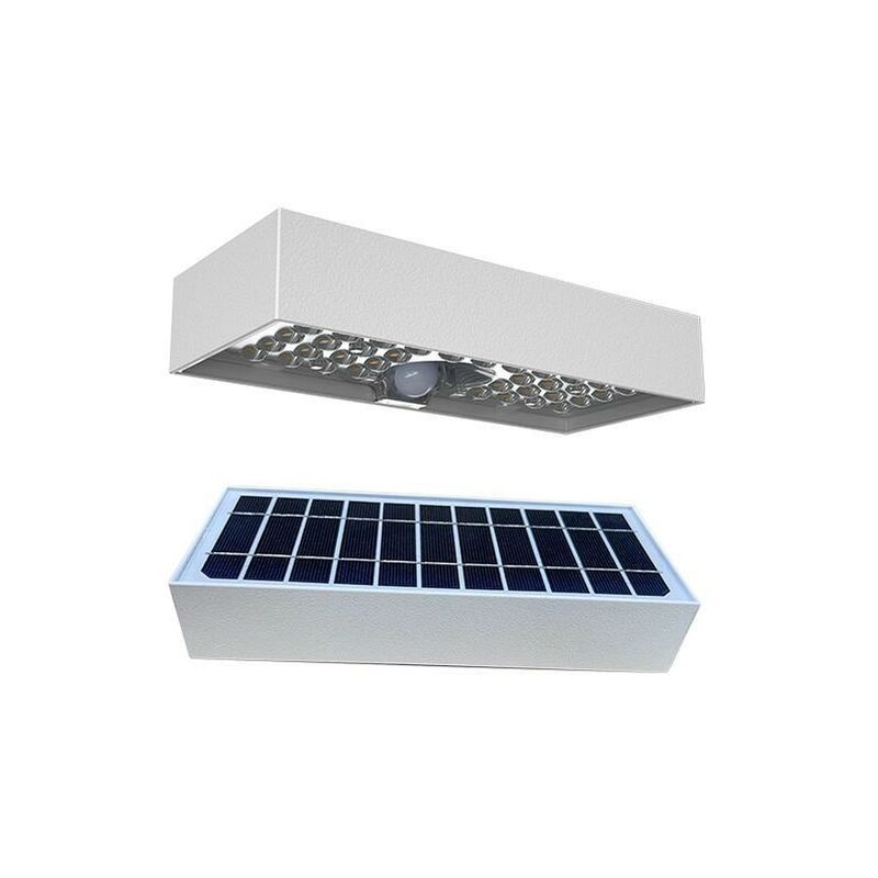 Applique lampada Solare da esterno 800 Lm IP65 Bianco IO67108 Proiettore solare LED dal design moderno, dotato di sensore PIR . Lo stile moderno permette di inserirlo facilmente in ogni contesto di arredo esterno, in giardino, così come su balcone e terrazzo. Caratteristiche: Proiettore solare LED. Design moderno. Con sensore PIR. Luminosità: 800 Lumen Potenza: 6 Watt Colore luce: 4000 gradi kelvin (Luce NATURALE) Led: 35 led SMD2835 Batteria: Li-ion 18650/3000mAh/3,7V/11.1Wh Pannello solare: Singolo vetro temperato (2.8W DC5.5V) Grado di protezione: IP65 Dimensioni: 230 X 97 X 42,7 mm Colore applique: Bianco Funzionamento: Modalità SENSORE: Batteria con carica residua > 30%: L'apparecchio è acceso con luminosità al 5%, quando rileva un movimento la luminosità passa al 100%. Dopo 20 secondi in cui non si rilevano movimenti la luminosità torna al 5% Batteria con carica residua < 30%: L'apparecchio è spento, quando rileva un movimento la luminosità passa al 100%. Dopo 20 secondi in