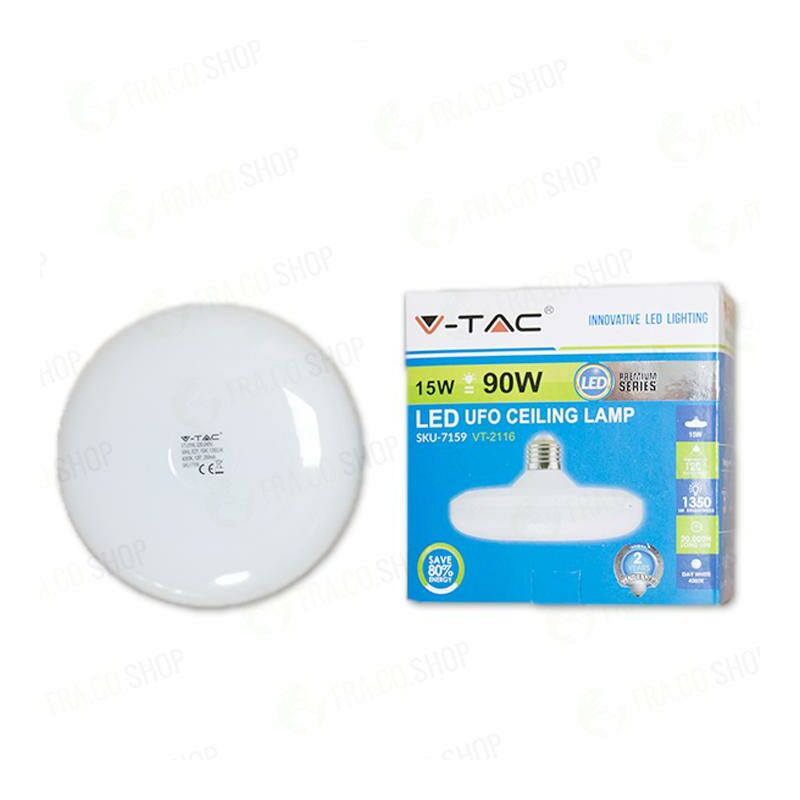 15W F150 UFO Lampada 3000K E27 SKU: 7158: VT: VT-2116 Caratteristiche del prodotto 80% di consumo energetico in meno rispetto alle lampadine standard Lunga durata Nessuna emissione di radiazioni UV e radiazioni non ionizzanti Accensione immediata, nessun tempo di riscaldamento Bassa potenza termica Direttamente sostituibile alle lampade ad incandescenza tradizionali Installazione Aree Commerciali e Residenziali Hotel, Bar Stand espositivi Lampadari Allaperto, esclusivamente allinterno di apparecchi idonei. Specifiche tecniche Informazione generale Attacco E27 Tipo Lampadina F150 Tipo LED SMD Vita media 20000 h Dati elettrici Potenza 15W Potenza EQV. a incandescenza 90W Tensione AC: 220-240V Frequenza 50Hz Fattore di potenza >0.5 Dati tecnici Luce Colore della luce Bianco caldo Temperatura di colore 3000K Flusso luminoso 1350 lm Indice di resa cromatica Ra >80 Fascio Luminoso 120 ° Dettagli corpo Materiale PC Colore Bianco Funzionalità Dimmerabile No Tempo innesco 100% 0.001 secondo