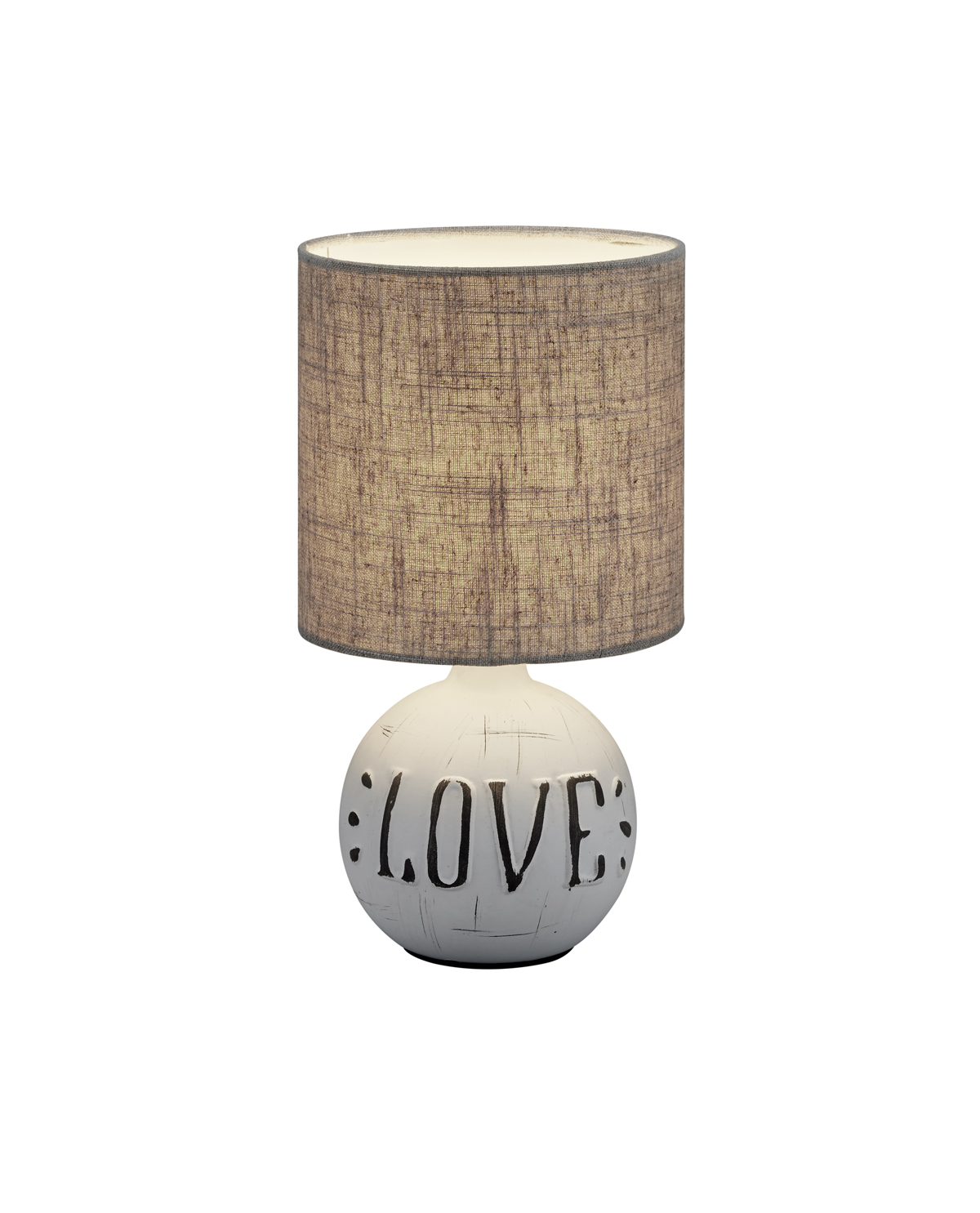Lampada da tavolo ceramica color sabbia con paralume color cappuccino escutta in rilievo "Love", altezza 30 cm. Particolarmente adatta ad ambienti arredamento Romantic Chic. Ceramica Decappata/lavorara con scritta in rilievo