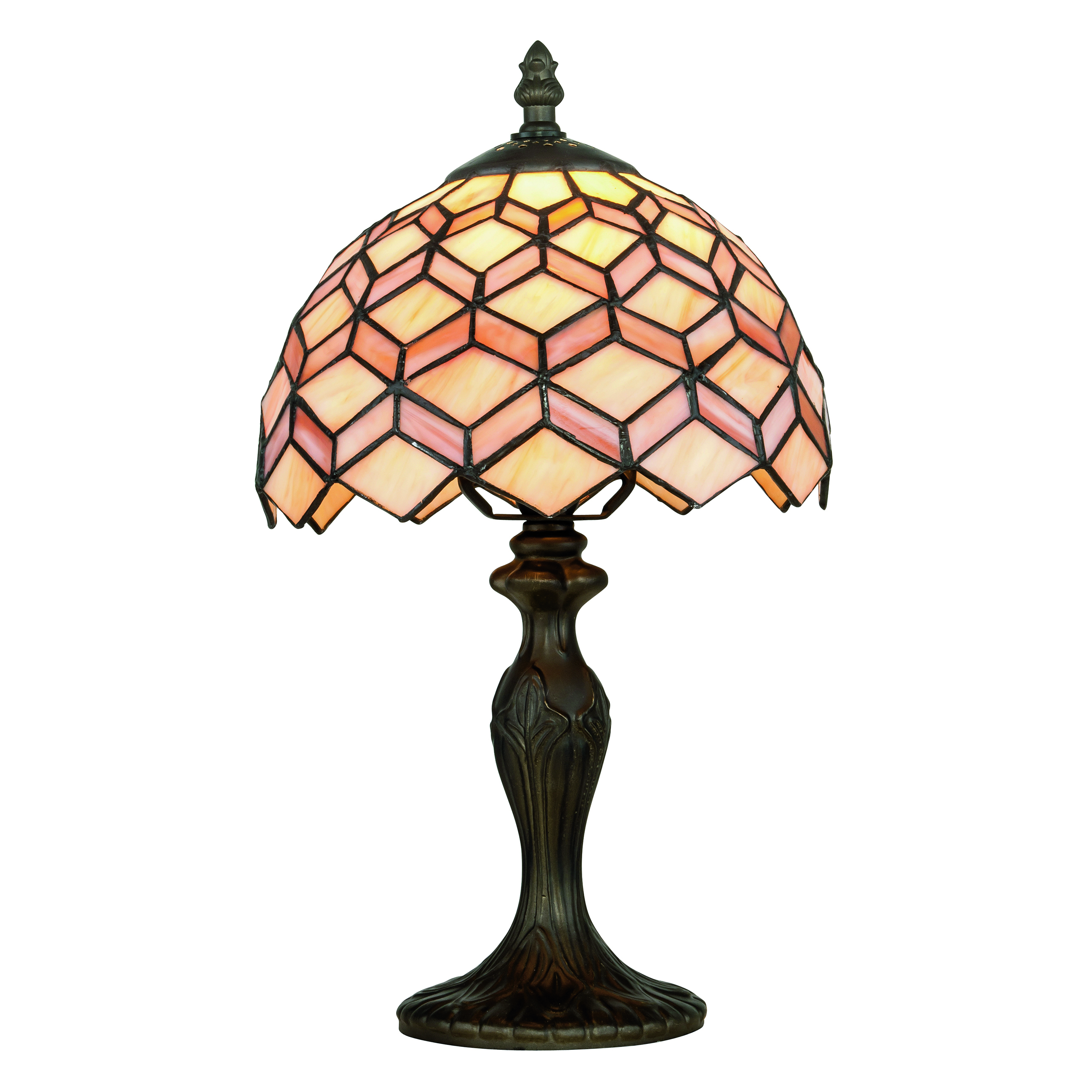 In metallo, diffusore in vetro colore arancione, giallo, ottone. Diffonde una luce diretta, ideale per la lettura