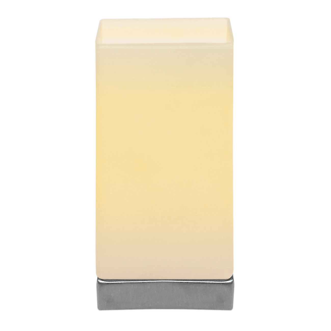 Lampada da tavolo con base metallica 100x100x25mm e paralume in vetro satinato 100x100x200mm, cavo bianco 1.5m, pulsante on/off "touch" con 3 livelli di dimmeraggio (N.B.: usare solo lampadine dimmerabili).