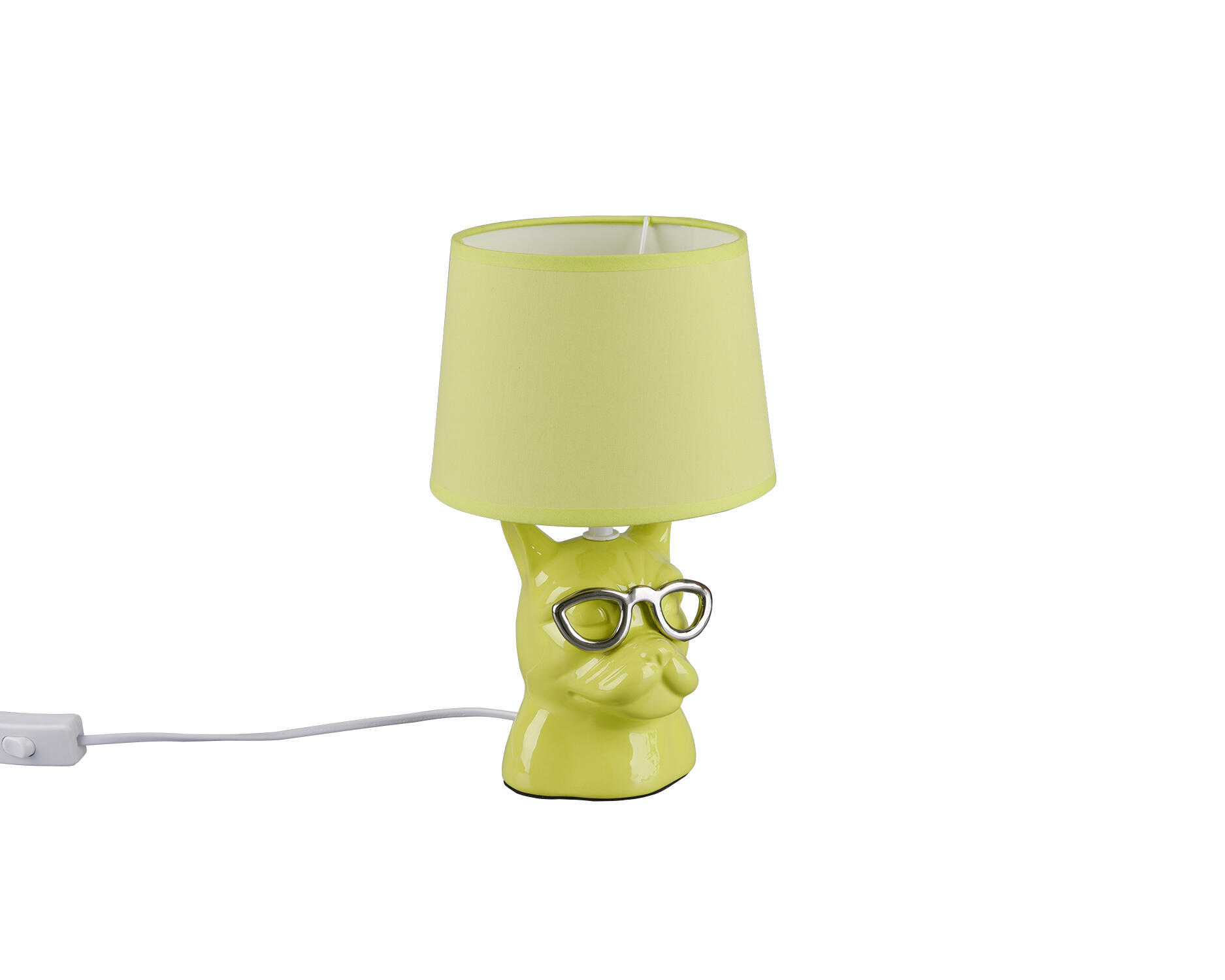 Lampada da tavolo Ceramica colore verde a forma di cane Bulldog con simpatici occhiali da vista e paralume in tessuto verde.Altezza 29 cm, adatta per ambienti vintage/moderni. Adattabilità ad ambienti moderni, camerette, ambienti Vintage. Colore Vivace