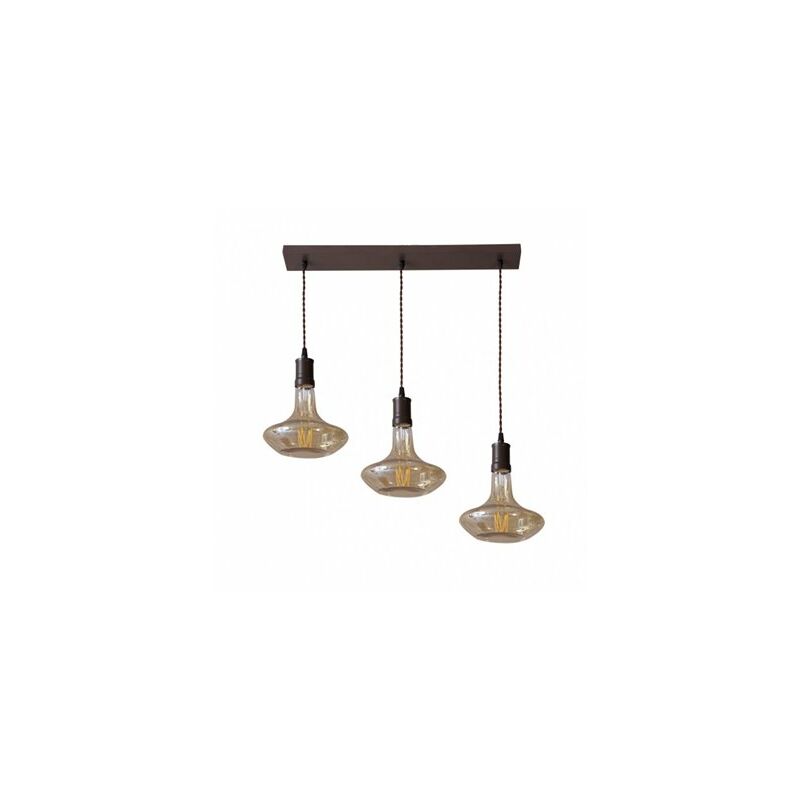 Pendente a tre luci della serie DACIO colore MARRONE/AMBRA. Realizzata in metallo, si distingue per il design moderno e diverso delle sue lampadine, sospese in linea a diverse altezze, con una potenza di 24 watt, 1920 lumen e luce calda, 3000K, con tre portalampada E27, che rende possibile per cambiare le tue lampadine, cambiando così l'estetica della lampada. Lampadine DECORATIVE VINTAGE incluse. Dal design originale, ideale per salotti e soggiorni e anche per zone di lavoro arredate in stile moderno, si inserisce molto bene anche in ambienti arredati con i nuovi stili Industrial e Vintage. Le sue dimensioni regolabili in altezza sono 44
