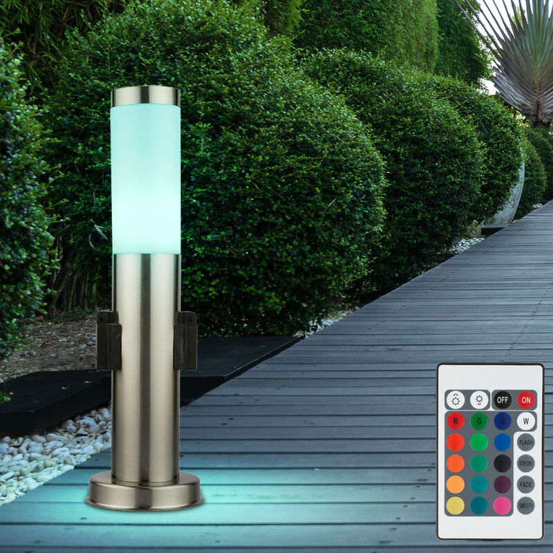 Descrizione Lampada da terra in acciaio inox per esterni. Con questa lampada da terra, ad esempio, puoi creare un percorso luminoso attraverso il tuo giardino o semplicemente mettere in scena le aree appropriate. Non ci sono limiti alle tue idee, perché grazie alla classe di protezione IP44, questa elegante lampada da terra resiste alle intemperie ed è predestinata per l'uso all'aperto. L' alloggiamento in acciaio inossidabile di alta qualità ti regalerà sicuramente anni di piacere. Con le due prese integrate, questa lampada non solo fornisce luce, ma anche elettricità per caricare attrezzi da giardino come un attrezzo da giardino. B. per poter azionare un tosaerba. Utilizzando il telecomando in dotazione, è possibile impostare l'illuminante LED RGB in diversi colori e garantire così un'atmosfera illuminazione. Nella fornitura sono incluse lampadine a LED RGB con telecomando per luce bianca e controllo RGB e una lampadina a LED. Dettagli luce • Tipo di lampada: Lampada da terra