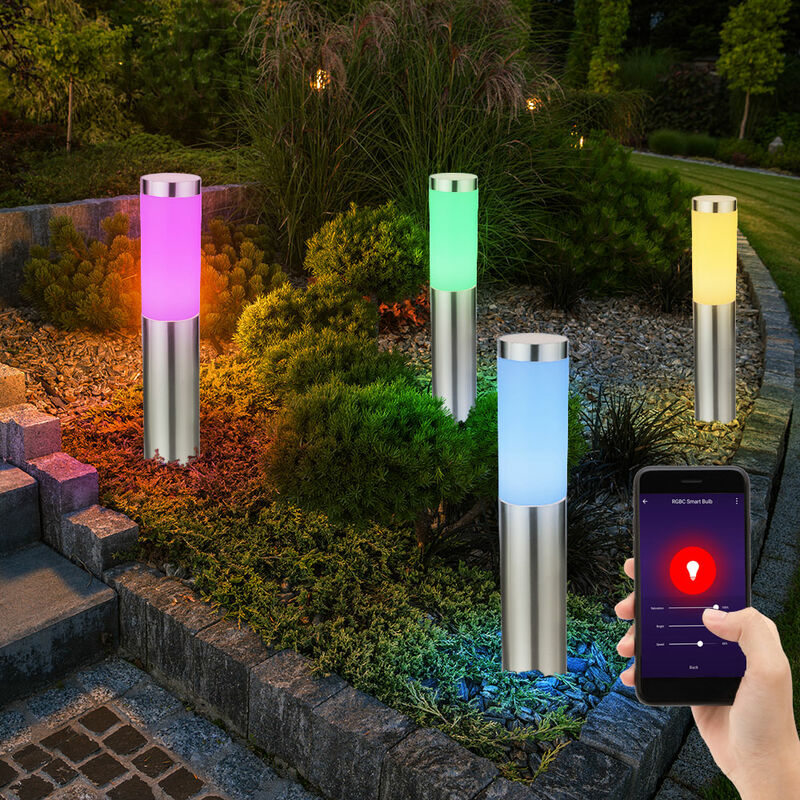 Descrizione Questa luce di percorso fornisce un'illuminazione atmosferica nell'ora buia. Al crepuscolo, le luci di vialetto come queste sono quasi indispensabili, soprattutto con una forma di base moderna e una combinazione di colori senza tempo. La lampada in acciaio inossidabile color argento colpisce per la sua semplice modernità e la sua classe di protezione IP44 resistente alle intemperie. In questo modo puoi illuminare in modo ottimale il tuo giardino e l'area esterna. La discreta luce del percorso ha un'altezza di 45 cm e si adatta quindi a qualsiasi ambiente. Grazie alla lampadina inclusa, puoi azionare comodamente la lampada dal divano utilizzando l'app o il comando vocale. Puoi utilizzare l'app per impostare il timer con diversi giorni della settimana e orari, nonché diversi colori di luce, colori, cambi di colore e programmi di illuminazione. Ciò garantisce un'illuminazione piacevole e d'atmosfera. È inclusa una lampadina LED Smart RGB. La fornitura comprende quattro luci