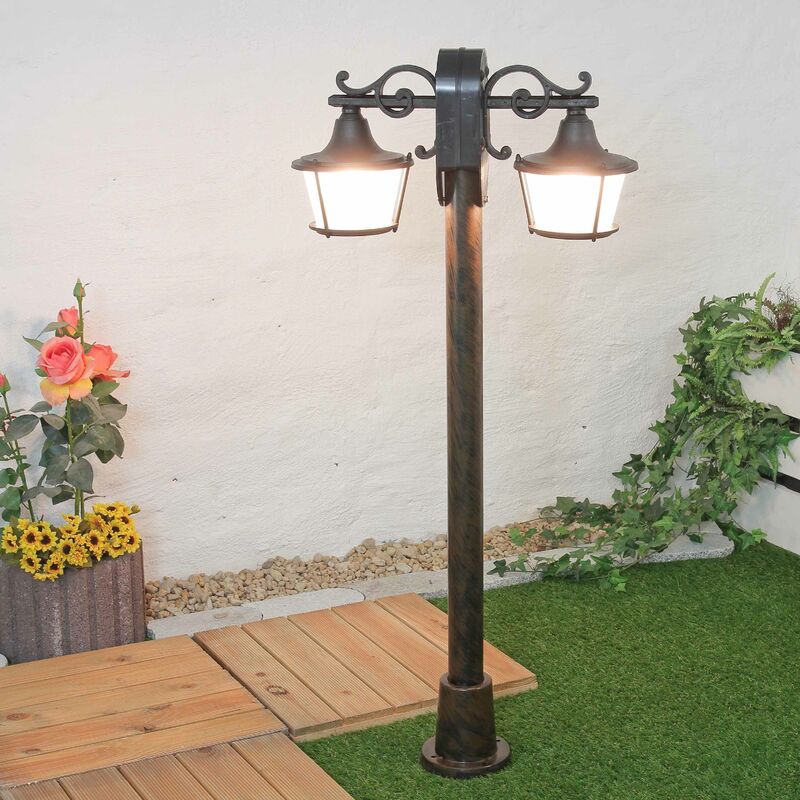 Dettagli del prodotto Materiale: Plastica, vetro Dimensioni: altezza: 1220 mm, lunghezza: 520 mm Attacco: 2xE27 fino a. 11W Classe di protezione dagli spruzzi: IP23 Colore: Nero Peso: 2500 grammo Descrizione del prodotto La lampada è realizzato in plastica, vetro Lampada da giardino in plastica resistenti alle intemperie e vetro, diametro base: 160