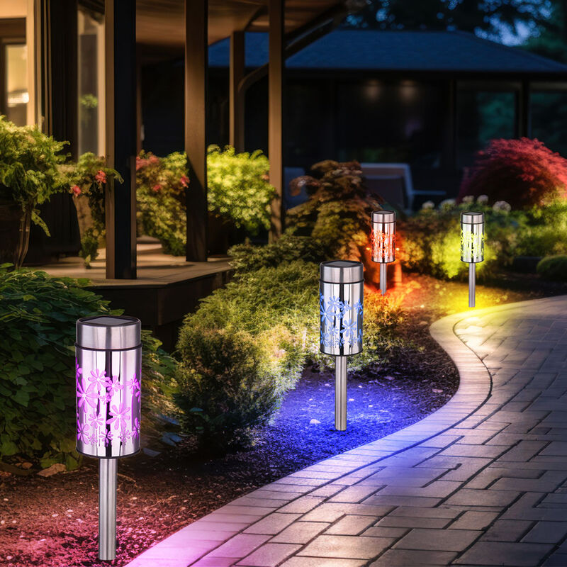 Descrizione Con queste luci solari LED RGB darete un accento molto speciale al vostro giardino. I colori si armonizzeranno perfettamente con l'ambiente della lampada che sceglierai. Grazie alle celle solari integrate, che caricano una batteria integrata, questa lampada può essere posizionata completamente senza collegamento alla corrente. Questa lampada solare si carica durante il giorno ed emette la luce immagazzinata fino a 8 ore al buio. Grazie alla classe di protezione IP44 la lampada è protetta dagli spruzzi d'acqua ed è quindi ideale per l'uso esterno. La sorgente luminosa è installata in modo permanente nella lampada. Nella consegna sono incluse quattro luci! Lampada dettagli • Tipo di luce: luce plug-in • Materiale: acciaio inossidabile, plastica • Argento • Grado di protezione: IP44 • Punzonature decorative • Solare • Interruttore • Batteria inclusa • Tempo di illuminazione: 6-8 ore • Tempo di ricarica: circa 6-8 ore • Diametro x altezza in cm: 6x41,5 • Sorgente luminosa: 1x