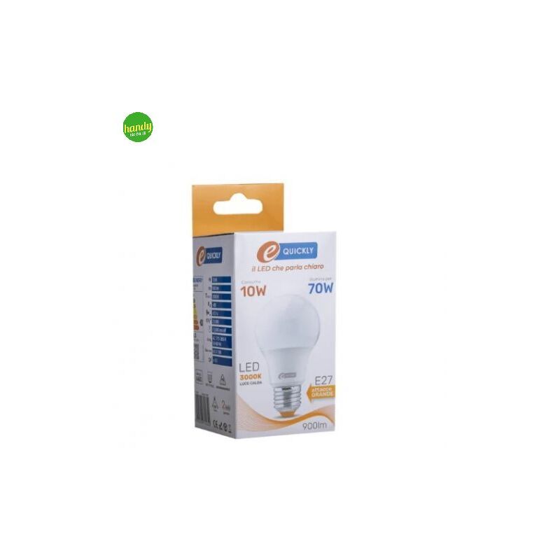 Lampadina Led prodotto dal brand E-Quickly. Lampadina con attacco E27, conpotenza di 10W può generare 900 lumen, luce bianca calda perfetta 3000K, l'efficienza della luce è uniforme e omogenea. La lampadina corrisponde ad una lampadina a incandescenza convenzionale da 70 W.La confezione contiene una lampadina.