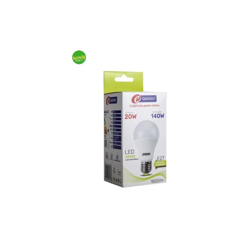 Lampadina Led prodotto dal brand E-Quickly. Lampadina con attacco E27, conpotenza di 20W può generare 1800 lumen, luce bianca naturale perfetta 4000K, l'efficienza della luce è uniforme e omogenea. La lampadina corrisponde ad una lampadina a incandescenza convenzionale da 140 W.La confezione contiene una lampadina.