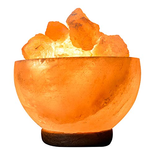 Lampada di Sale dell'Himalaia con Ciotola e Rocce, Base in Legno