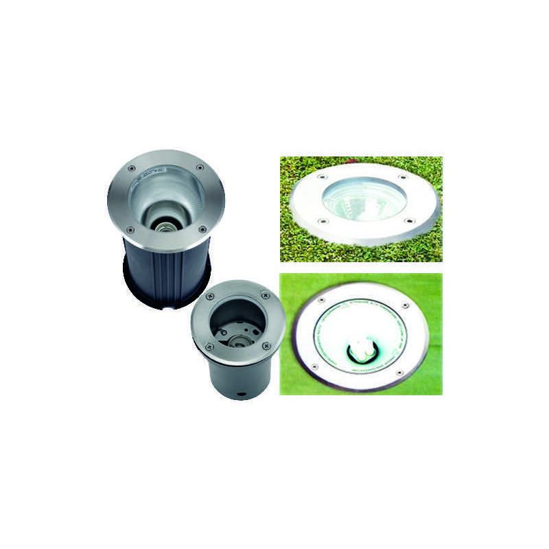 Disco di copertura in acciaio inox, corpo interno in alluminio, esterno in plastica. schermo in vetro infrangibile calpestabile (max 500 kg). max 50 watt. certificazione ip 67. diametro 18 cm.