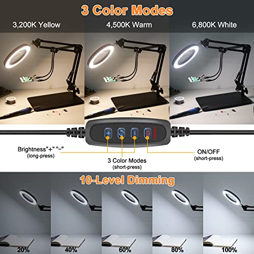 Diverse temperature di colore e luminosità opzionali: lampada a LED ad alta luminosità da 72 pezzi, questa lampada di ingrandimento a led ha 3000K-4000K-5000K e 10 livelli dimmerabili, può soddisfare vari ambienti di lavoro. 3 modalità di colore (bianco, bianco caldo, caldo). Un pulsante di luminosità a pressione prolungata può consentire di regolare il livello di luminosità tra il 10% e il 100%, molto adatto per il tuo hobby.