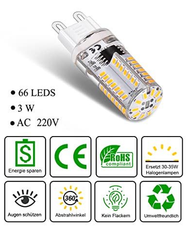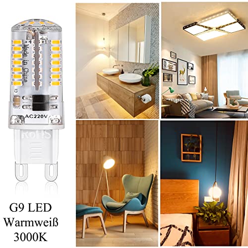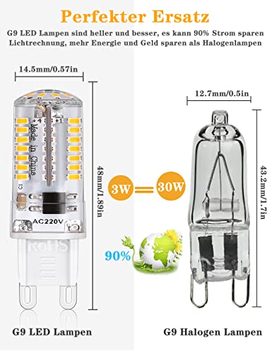 【Super luminoso】: Dimensioni 14,5 mm x 48 mm, lampadina LED 3W 3000K G9 bianco caldo, 400LM, angolo di illuminazione AC 220V 360 °, nessun sfarfallio e ronzii, NON dimmerabile e senza base