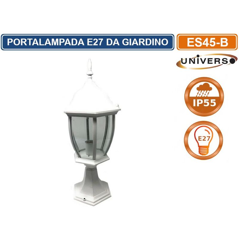 Portalampada Universo ES45-C da Giardino per Lampadine E27. Forma a lanterna con corpo in alluminio di colore bianco e copertura trasparente in vetro. Ideale per l'illuminazione esterna della casa. Grazie al corpo realizzato interamente in alluminio e al grado di protezione IP55, è adatto per resistere per molto tempo all'esterno in luoghi riparati (temperatura di esercizio da -20 C° a +40 C°). Facile da montare, grazie alla connessione tramite morsetti a vite. Nella confezione riceverete 2 viti con tasselli e la staffa per il fissaggio a terra. Compatibile con lampadine E27 di potenza massima 60W. Complemento perfetto per un giardino rustico. Lampadine E27 non incluse. Dimensioni: 175 x 175 x 480 mm. Le lampadine LED E27 compatibili con questo prodotto le potete trovare nel nostro negozio.