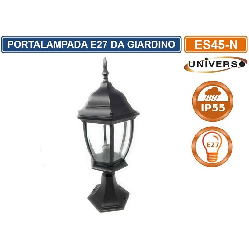 Portalampada Universo ES45-C da Giardino per Lampadine E27. Forma a lanterna con corpo in alluminio di colore nero e copertura trasparente in vetro. Ideale per l'illuminazione esterna della casa. Grazie al corpo realizzato interamente in alluminio e al grado di protezione IP55, è adatto per resistere per molto tempo all'esterno in luoghi riparati (temperatura di esercizio da -20 C° a +40 C°). Facile da montare, grazie alla connessione tramite morsetti a vite. Nella confezione riceverete 2 viti con tasselli e la staffa per il fissaggio a terra. Compatibile con lampadine E27 di potenza massima 60W. Complemento perfetto per un giardino rustico. Lampadine E27 non incluse. Dimensioni: 175 x 175 x 480 mm. Le lampadine LED E27 compatibili con questo prodotto le potete trovare nel nostro negozio.