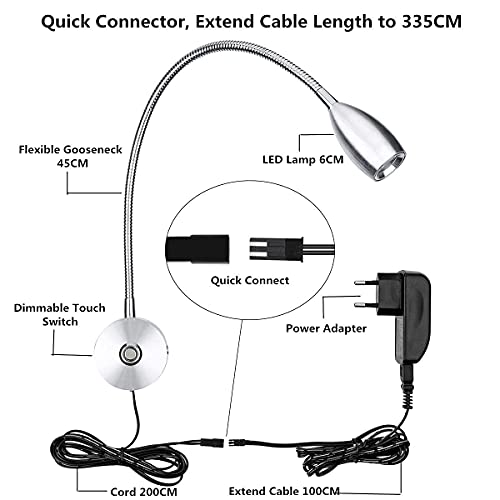 Lampada da lettura a LED lampada a collo d'oca lampada da letto dimmerabile lampada da letto lampada da lettura camera da letto lampada da lettura luce da lettura interruttore tattile 3W 200lm 3000k