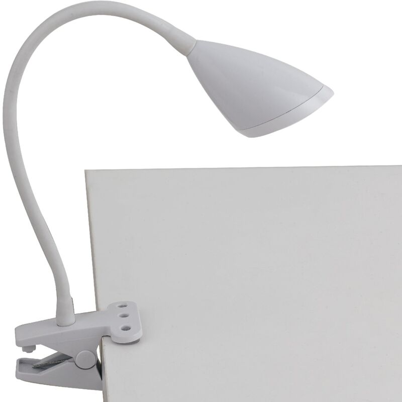 Lampada da tavolo in metallo con flessible in silicone e testa in fibre plastiche. Dotata di una pratica pinza per fissaggio su tavolo. Colore: Bianco Materiale: Metallo e silicone Tipo sorgente o lampadina richiesta: LED Watt: 3,7W Lumen: 700 Lumen Kelvin: 4000k Grado di protezione da corpi solidi e acqua: IP20 (solo uso interno) Altre informazioni: ;