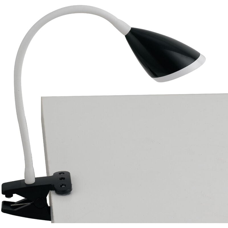 Lampada da tavolo in metallo con flessible in silicone e testa in fibre plastiche. Dotata di una pratica pinza per fissaggio su tavolo. Colore: Nero Materiale: Metallo e silicone Tipo sorgente o lampadina richiesta: LED Watt: 3,7W Lumen: 450 Lumen Kelvin: 4000k Grado di protezione da corpi solidi e acqua: IP20 (solo uso interno) Altre informazioni: ;