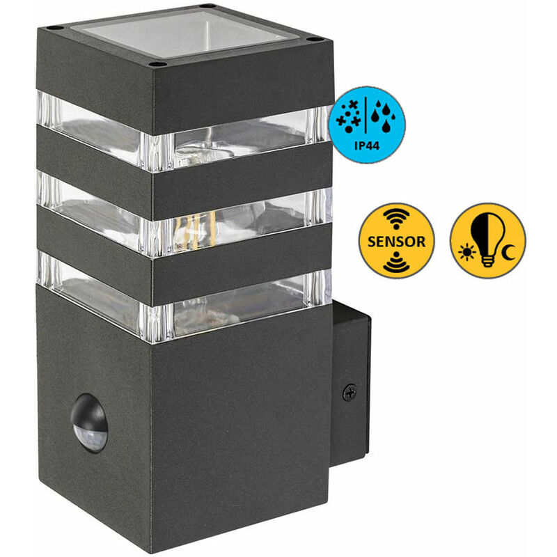Lampada a parete Ankara Antracite E27 12W IP44 L: 9cm B: 13,5 cm H: 20 cm Dimmabile con sensore Dimensioni in mm: Lunghezza: 90, larghezza: 200, Peso in kg: 0.825 Tipo di lampada/versione: E27 Lampade contengono: No Prestazioni massime in Watt: 12w Classe di protezione: IP44 Dimmbar: Sì Sensore: Sì Materiale per la casa: Alluminio Colore abitativo: anthrazit Materiale vetro/picchi: Plastica Colore vetro/ombrello: trasparente Informazioni aggiuntive: Rilevatore di movimento, sensore di luce