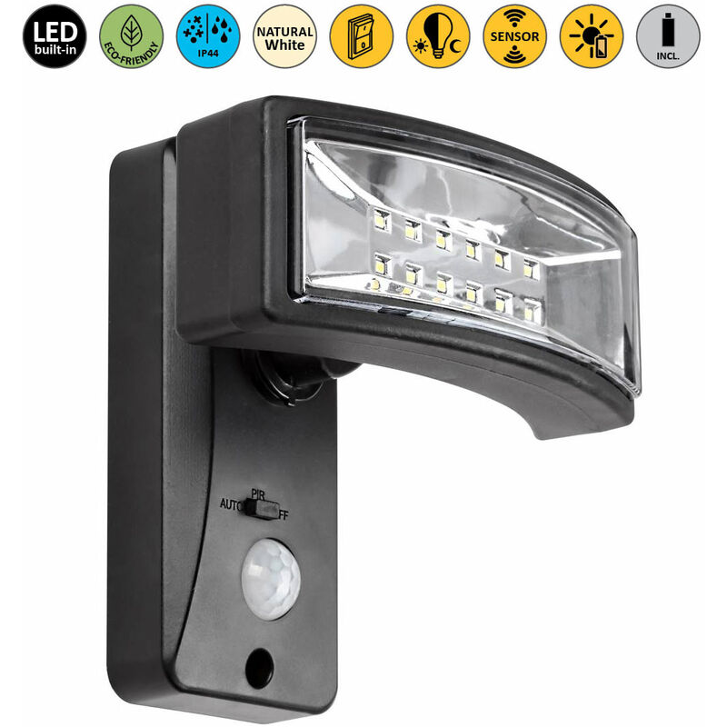 Lampada murale Valpovo Plastica LED nero LED 2.4W IP44 4000K L: 15,5 cm B: 12 cm con sensore Dimensioni in mm: Lunghezza: 155, larghezza: 120, Peso in kg: 0,528 TIPO MEDIO LUMINATO/versione: LED Lampade contengono: Sì Prestazioni massime in Watt: 2,4w Colore chiaro in Kelvin: 4000k Colore della luce: Neutralweiß Flusso luminoso in lume: 250 Classe di protezione: ip44 Dimmbar: No Switch: Sì Sensore: Sì Materiale di alloggio: Plastica Colore abitativo: schwarz Materiale vetro/picchi: plastica Colore di vetro/ombrello: trasparente Informazioni aggiuntive: Rilevatore di movimento, sensore di luce