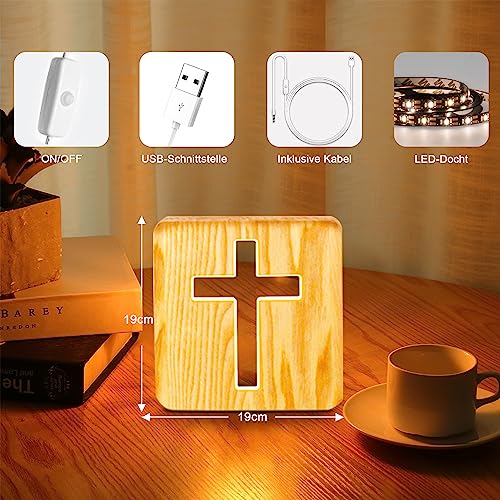 Lampada notturna a LED, con croce di Gesù, modellazione creativa, intaglio in legno, luce bianca calda, con USB, decorazione in legno, regalo illuminato per cristiani religiosi