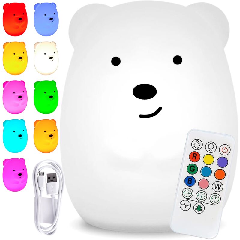 Lampada notturna in silicone Misiek LED RGB Destinazione d'uso: per bambini | Colori: 9 colori di luce Una lampada notturna a forma di simpatico orsacchiotto LED è perfetta come regalo per il tuo bambino. La lampada è realizzata in silicone morbido e sicuro e non contiene sostanze tossiche. Questo rende il prodotto adatto anche ai bambini. Questo adorabile orsacchiotto ha 3 modalità operative, 9 colori e 3 timer. Grazie alla luce calda e rilassante potrete addormentarvi molto facilmente. La lampada notturna a LED è alimentata da 3 batterie AAA o dal cavo USB incluso nel set. Il controllo avviene tramite telecomando o toccando la lampada. Di notte funge da lampada da comodino accanto al letto. Durante il giorno si trasforma in una decorazione mozzafiato. "Adotta" il tuo MSI per goderti la sua multifunzionalità. Caratteristiche del prodotto LED RGB 3 modalità di funzionamento 9 colori 3 timer Cambio di luminosità Modalità lampeggiante Modalità fluida Modalità continua Ecologico Silicone