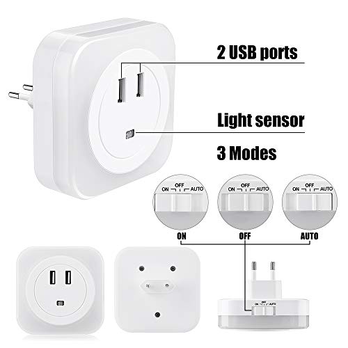 Lampada Notturna LED, SOLMORE Luce Notturna con Caricatore USB a 2 Porte, Automatiche Lampade da Presa con Sensore di Luce per Bambini Camera da Letto Bagno Corridoio