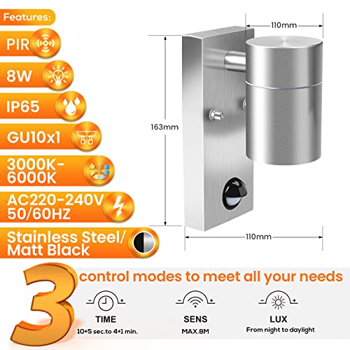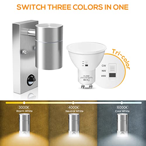 Lampada da parete esterna con sensore di movimento, luce verso il basso con sensore PIR, luce di sicurezza esterna argento IP65, lampadina LED GU10 da 8 W inclusa, temperatura a 3 colori commutabile
