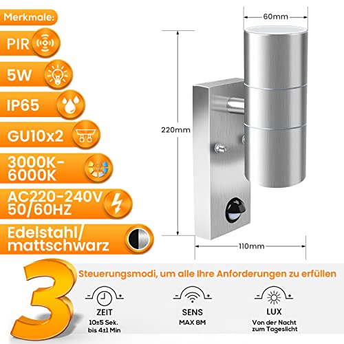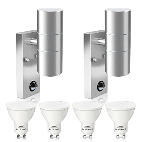 Lampada da parete per esterni in acciaio inox con sensore di movimento PIR Applique IP65 Lampada di sicurezza da giardino con lampadine LED GU10 da 5 W bianco freddo 6000 K, argento, confezione da 2