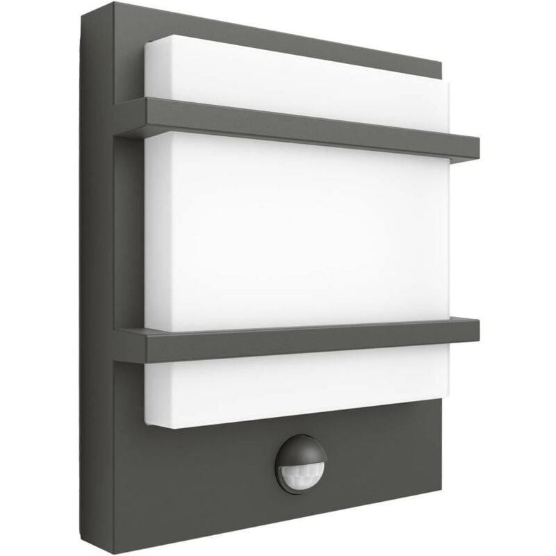Dettagli tecnici Caratteristiche della lampada Incl. rilevatore di movimento Colore Antracite Colore luce Bianco caldo Dimensione del prodotto, larghezza 190 mm Dimensione del prodotto, lunghezza 60 mm Dimensioni (L x L x A) 60 x 190 x 227 mm Dimensioni prodotto Altezza 227 mm Materiale Alluminio Numero di lampadine 1 Peso 660 g Potenza 3.8 W Potenza (Lampadina) 3.8 W Stile (lampade) Design moderno Tensione di funzionamento 230 V Tipo lampadina LED (monocolore) Tipo prodotto Lampada LED da parete per esterno con rilevatore di movimento Philips Outdoor Ultra-Efficient Petronia lampada da parete 3.8W La lampada da parete Philips Petronia Ultra-Efficient LED per esterni in antracite circonda un pannello luminoso con una robusta cornice in alluminio pressofuso ed è adatta per il montaggio a parete e a soffitto. Dispone inoltre di un sensore di movimento per una distanza fino a 10 m e un angolo di rilevamento di 110°. La lampada per esterni ultra efficiente con soli 3,8 W di consumo