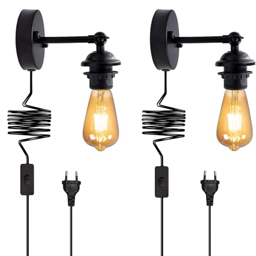 Lampada da parete industriale per interni, 2 pezzi, braccio orientabile regolabile, con interruttore e cavo da 180 cm, attacco E27, in metallo nero, corridoio, camera da letto