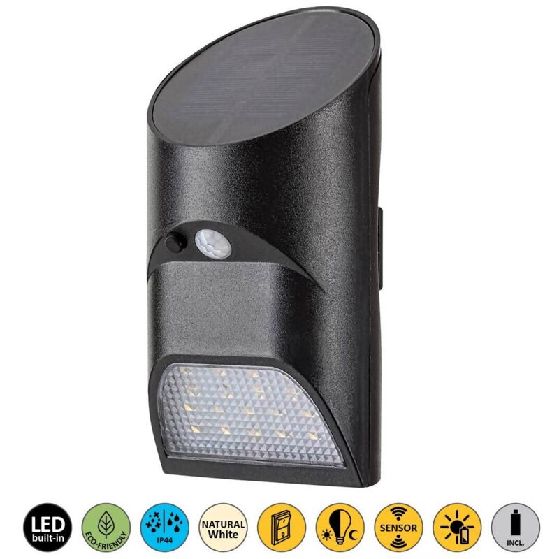 Lampada a muro LED in plastica Sepik LED 3.6W IP44 4000K L: 8 cm B: 8 cm H: 16 cm con sensore Dimensioni in mm: Lunghezza: 80, larghezza: 160, Peso in kg: 0,22 Tipo di lampada/versione: LED lampada contenuta: Sì Prestazioni massime in watt: 3.6w Colore della luce in Kelvin: 4000k Colore della luce: Bianco neutro flusso luminoso in lume: 150 Classe di protezione: ip44 Dimmbar: No Switch: Sì Sensore: Sì materiale per la casa: plastica Colore abitativo: Black Br/> Materiale vetro/picchi: Plastica Colore vetro/ombrello: bianco Informazioni aggiuntive: Rilevatore di movimento, sensore di luce