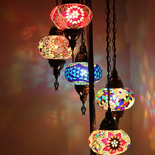 Lampada da pavimento fatta a mano, stile turco/marocchino/ottomano, con 5 globi in vetro a mosaico stile Tiffany