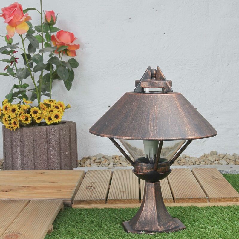 Dettagli del prodotto Materiale: Alluminio, plastica Dimensioni: larghezza: 320 mm, altezza: 435 mm, lunghezza: 320 mm Attacco: 1x E27 fino a. 23W Classe di protezione dagli spruzzi: IP43 Colore: Rame antico Peso: 1400 grammo Descrizione del prodotto La lampada è realizzato in alluminio, plastica Lampada da giardino in alluminio e plastica resistenti alle intemperie, diametro base 13 cm