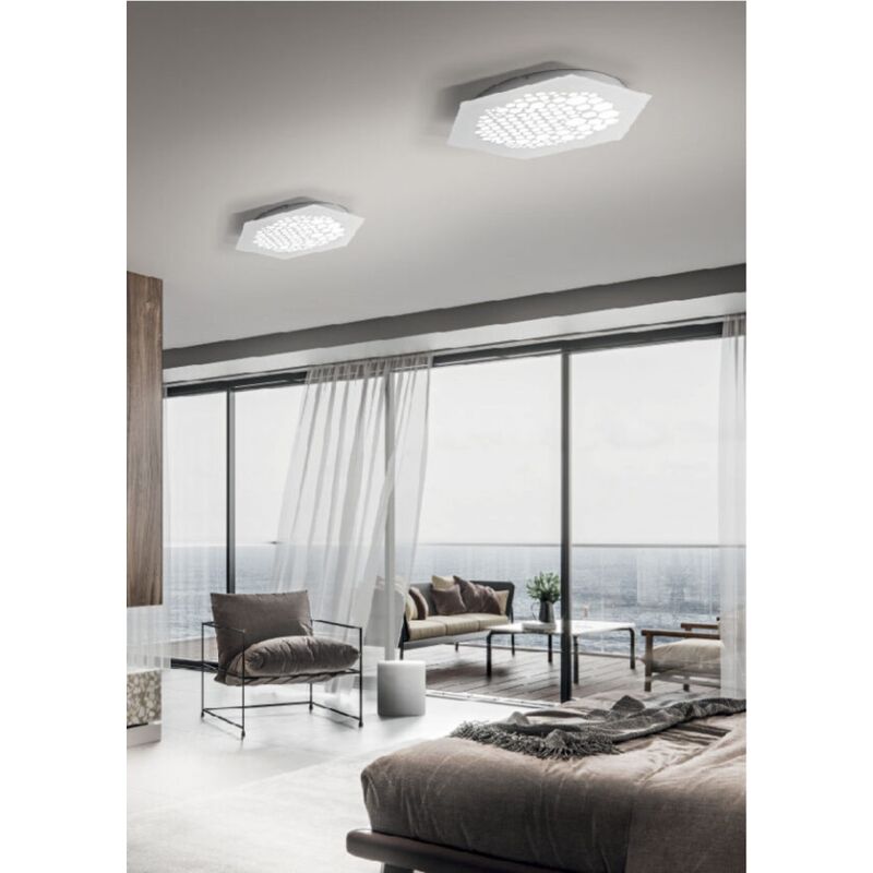 Lampada Plafoniera ALVEARE led in metallo bianco opaco realizzata in metallo,intagliata a laser con diffusore in lastra polimerica. Modello Medio. . La plafoniera a Led ALVEARE e' composta da una lastra esagonale realizzata in metallo bianco opaco lavorato e intagliato a laser con diffusore in lastra polimerica. Questa lampada moderna puo' adattarsi in modo unico e originale in ogni tipo di ambiente come ad esempio il soggiorno living. CARATTERISTICHE Colore: Bianco Opaco Modello: Medio Materiale: Metallo con diffusore in lastra polimerica Tipologia: Plafoniera Larghezza: 52 cm Altezza: 52 cm Profondità: 5,5 cm Dimmerabile: NO Illuminazione: LED integrato Potenza: 33W 1521-3150LM Input: 220-230V Colore luce: 3000K