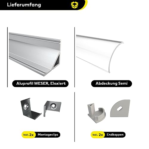 VOLUME DI CONSEGNA: SEMI copertina 100 cm + 100 cm profilo di alluminio LED ANGOLO-rotondo per strisce LED (senza accessori - ma anche disponibile qui) - Dimensioni del prodotto: 100 cm (lunghezza), 16,0 mm (larghezza) e 16, 0 mm (altezza) - Profilo LED in alluminio Adatto per strisce LED fino a 12 mm RGB RGBW - Particolarmente utilizzato negli angoli