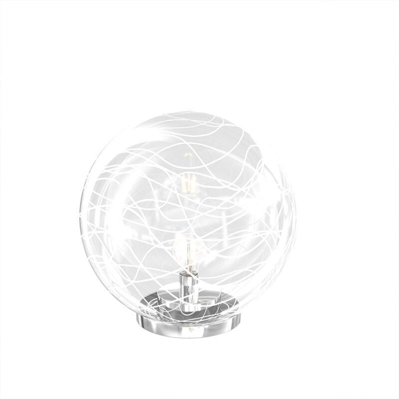 Collezione Moon LUCE E ARTE, UN CONNUBIO PERFETTO Lampada da appoggio con un globo di vetro soffiato trasparente dal diametro di 30cm, impreziosito da una decorazione in filo di vetro in finitura bianco.. Creando un effetto di luce e colore suggestivo e romantico. La struttura è in metallo cromato, che le conferisce un tocco di eleganza e di modernità. Moon è la luce che dona fascino e personalità al tuo spazio, sia che tu la usi per illuminare il tuo soggiorno, la tua camera da letto o il tuo bagno.Questo articolo è disponibile in diverse finiture e/o dimensioni. E' possibile indicarlo nell'apposito campo NOTE presente in conclusione di ordine oppure contattarci dopo aver effettuatol'ordine.