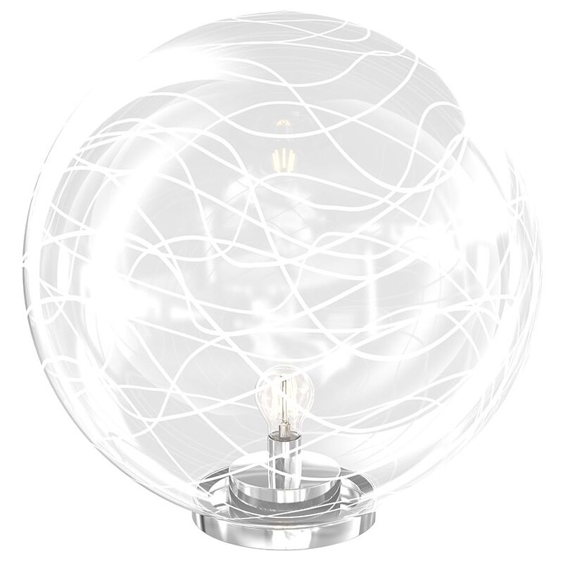 Collezione Moon LUCE E ARTE, UN CONNUBIO PERFETTO Lampada da appoggio con un globo di vetro soffiato trasparente dal diametro di 40cm, impreziosito da una decorazione in filo di vetro in finitura bianco.. Creando un effetto di luce e colore suggestivo e romantico. La struttura è in metallo cromato, che le conferisce un tocco di eleganza e di modernità. Moon è la luce che dona fascino e personalità al tuo spazio, sia che tu la usi per illuminare il tuo soggiorno, la tua camera da letto o il tuo bagno.Questo articolo è disponibile in diverse finiture e/o dimensioni. E' possibile indicarlo nell'apposito campo NOTE presente in conclusione di ordine oppure contattarci dopo aver effettuatol'ordine.