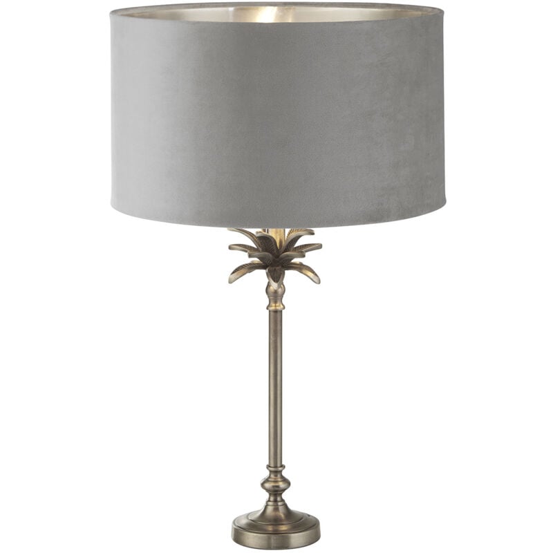 Collezione Palma LAMPADA IDEALE La lampada Palm Tree è la perfetta combinazione di stile e funzionalità. Questa splendida lampada presenta un design senza tempo che si abbina perfettamente sia agli interni tradizionali che a quelli contemporanei. Progettata con materiali di alta qualità, la lampada presenta una base in nichel antico a forma di palma che aggiunge un tocco di eleganza e raffinatezza a qualsiasi stanza. Il colore grigio chiaro e nichel antico emana calore e ricchezza, creando un punto focale accattivante nel tuo spazio. Questa lampada da tavolo è dotata di un bellissimo paralume in velluto grigio chiaro con interno in argento metallizzato, che aggiunge un tocco lussuoso e raffinato al design complessivo. Il colore grigio chiaro aggiunge un morbido calore a qualsiasi soggiorno o camera da letto.