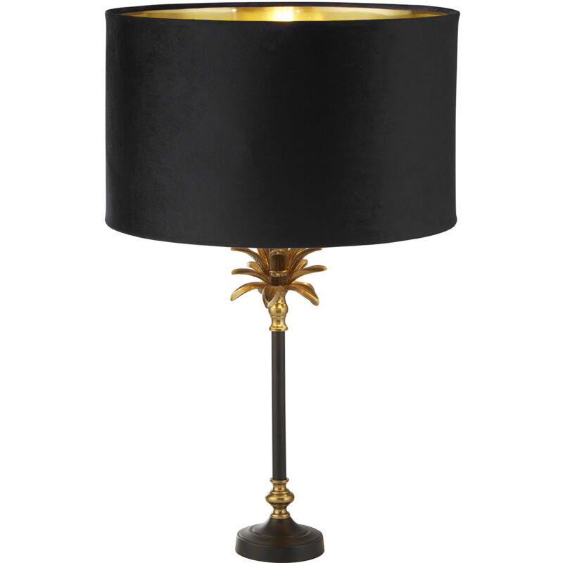 Collezione Palma LAMPADA IDEALE La lampada Palm Tree è la perfetta combinazione di stile e funzionalità creando la lampada da tavolo perfetta per qualsiasi camera da letto o zona giorno. La lampada presenta una base in metallo nero e ottone antico a forma di palma, sormontata da un lussuoso paralume in velluto nero con interno in oro metallizzato, che aggiunge un tocco di eleganza e raffinatezza a qualsiasi stanza. Il colore nero e ottone antico emana calore e ricchezza, creando un punto focale accattivante nel tuo spazio.
