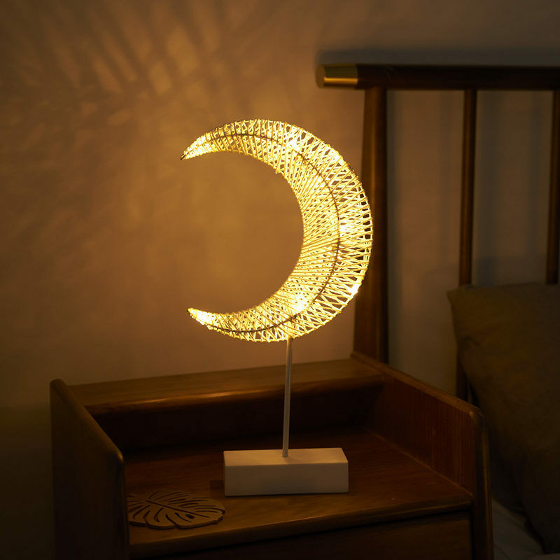 LOOK SVEGLIO - La lampada da tavolo a led a forma di luna è molto raffinata e abbastanza chic da attirare i bambini, che è tessuta con filo bianco e, quando accesa, emette una luce calda per illuminare lo spazio della stanza. < p>LUCE MORBIDA - bianco caldo che aiuta a creare un'atmosfera calda e romantica e aiuta ad addormentarsi. Immergiti nella luce soffusa e rilassati. Ideale per personalizzare la tua camera da letto, stanza dei bambini, soggiorno, ecc. SALVA OCCHI - Morbida e confortevole, la luce bianca calda della lampada creerà un'atmosfera calda mentre la luce calda è più amichevole per i tuoi occhi. Nessuno sfarfallio, nessun abbagliamento. Compagno impeccabile quando lavori o dormi. ALIMENTAZIONE A BATTERIA - Solo alimentazione a batteria. Questo prodotto non contiene cavi aggiuntivi, quindi puoi posizionare in sicurezza la lampada dove vuoi. RISPARMIO ENERGETICO - che farà risparmiare energia e aumenterà la durata della batteria. Risparmia i tuoi soldi, risparmia le
