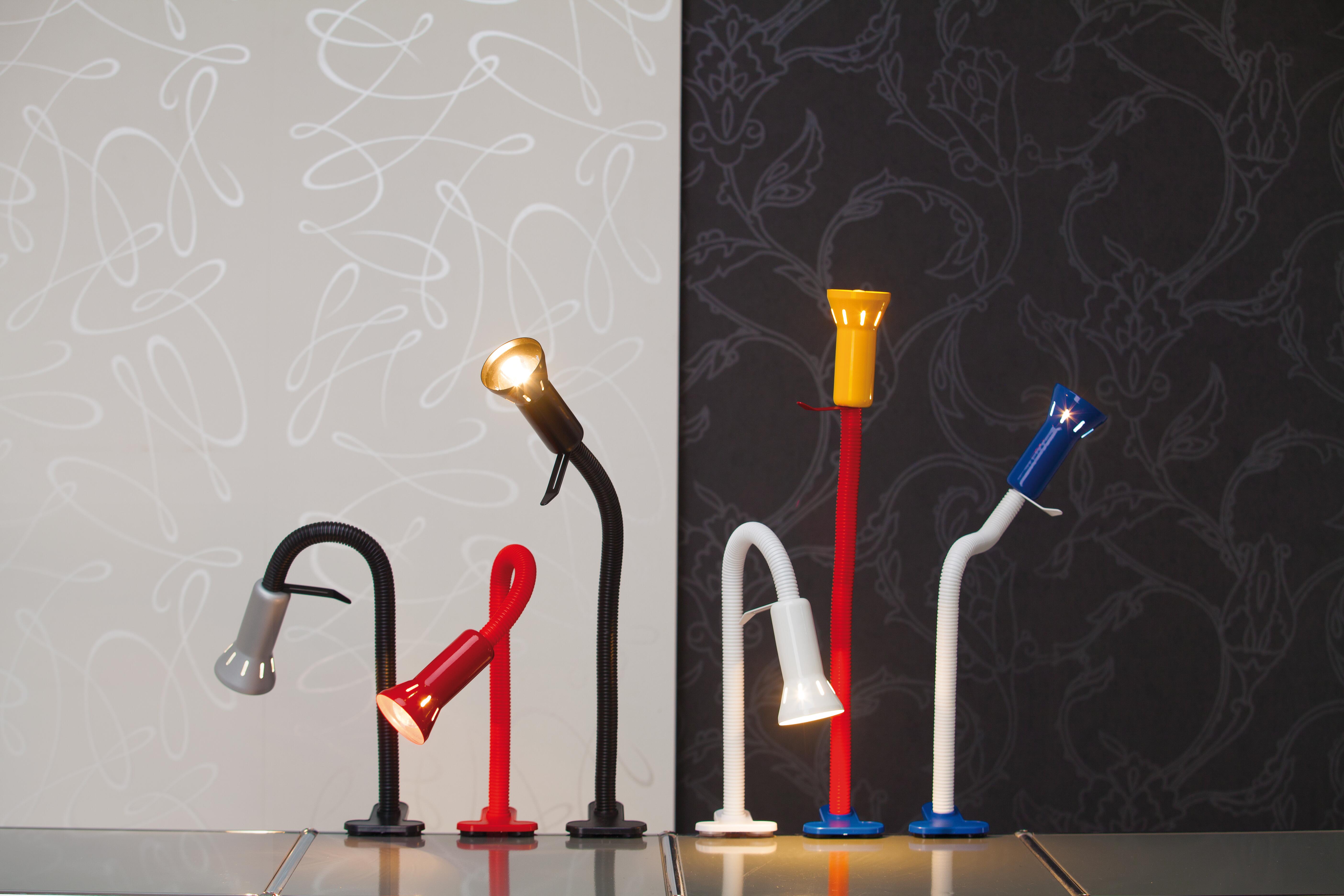 Lampada da scrivania con pinza, di colore bianco, in metallo e plastica. E' dotata di un attacco E14. Disponibile anche in altre colorazioni.