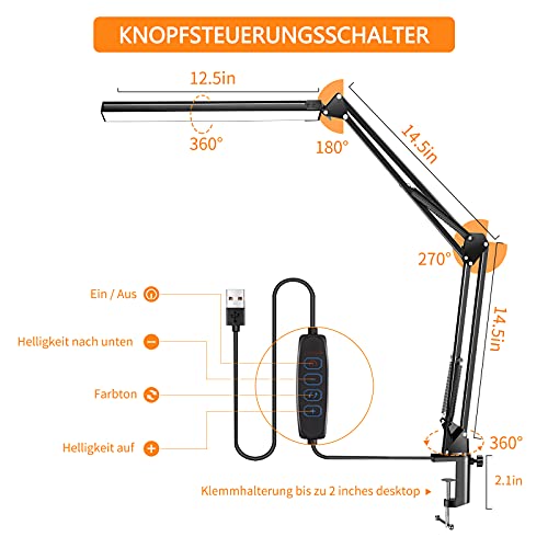 【 Morsetto in metallo extra largo e braccio flessibile 】 Il design a 3 assi di questa lampada da tavolo consente una maggiore flessibilità e una maggiore superficie di illuminazione: testa della lampada girevole a 360°, base girevole a 360°, braccio in metallo regolabile a 270°. La lampada da tavolo può essere posizionata a diverse altezze e posizionate secondo necessità e allo stesso tempo è salvaspazio.