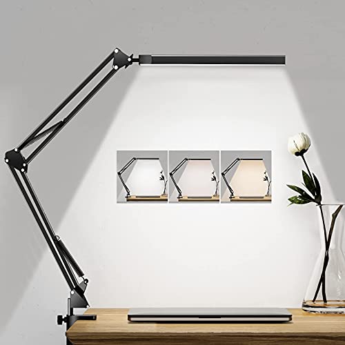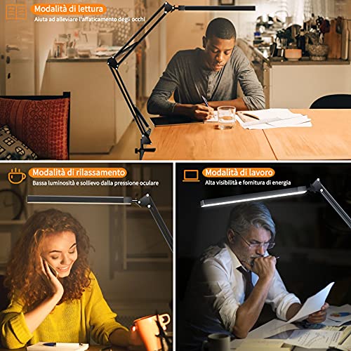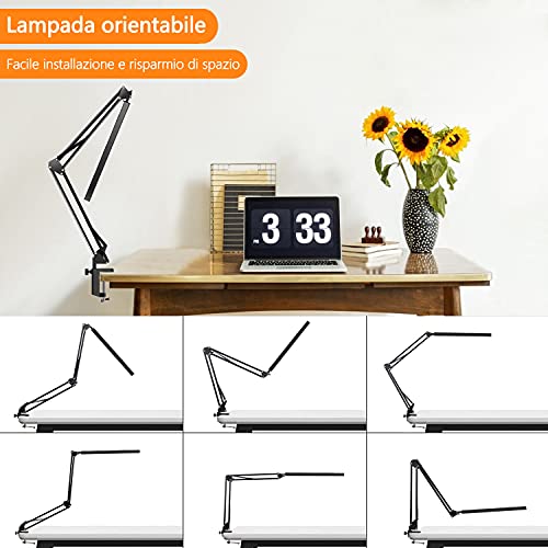 Lampada da scrivania a LED con morsetto, brightower lampada da tavolo dimmerabile, luce di lettura per la cura degli occhi, lampada a braccio oscillante a 3 modalità colore, 3000K-6000K