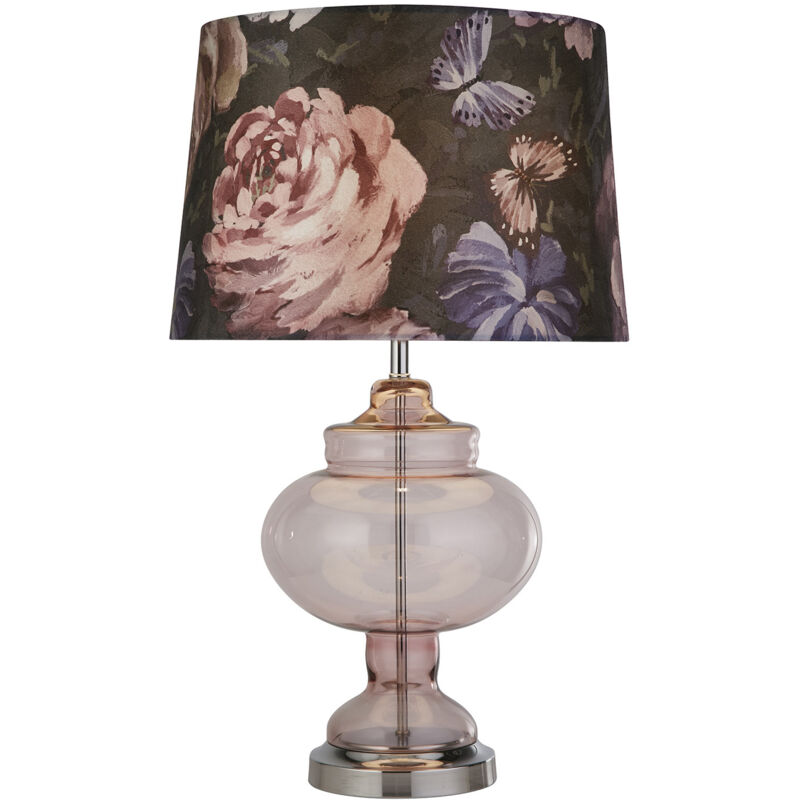 Collezione Sanderson TOCCO DI OPULENZA La lampada da tavolo Sanderson è l'aggiunta perfetta a qualsiasi stanza che richiede un tocco di opulenza. Sia che venga in una camera da letto o in un soggiorno, si abbina facilmente sia allo stile tradizionale che a quello contemporaneo. Caratterizzata da un paralume floreale in tessuto multicolore con una base sagomata in vetro color malva, questa lampada da tavolo floreale affascina con il suo design straordinario.