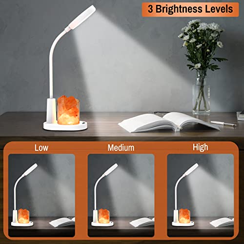Lampada da Scrivania, Lampada da Tavolo con Sale dell'Himalaya, Cambio Colore Automatico, Collo d'oca Regolabile a 360°, 3 Livelli di Luminosità, con Portapenne, Colore Bianco