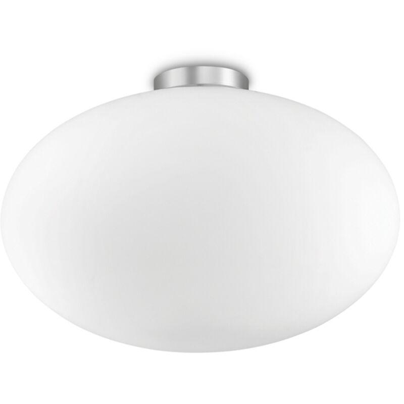 Montatura in metallo con finitura nickel satinato. Diffusore in vetro bianco soffiato e acidato. Ø 400 x H 250 mm max 1 x 60W E27 IP:20