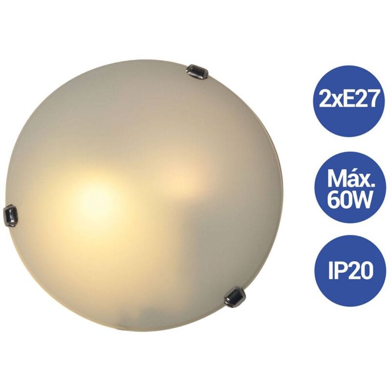 Lampada da soffitto rotonda in vetro. Design rotondo, semplice e classico. Può essere aggiunto a qualsiasi ambiente interno. Coperchio in vetro smerigliato traslucido a forma di luna, rotondo. Il vetro è tenuto in posizione da tre alette metalliche. Dispone di due prese per lampadine E27 con una potenza massima di 60W ciascuna. Misure Ø300X80mm. **NON INCLUDE LE LAMPADINE E27**. 230V/AC 2xE27 Ø300X80mm IP20