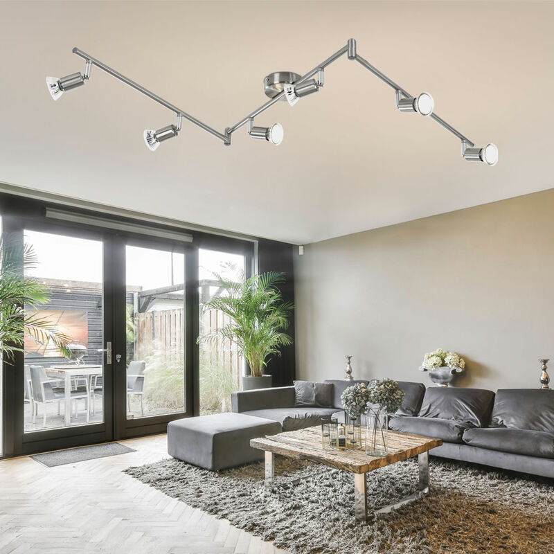 Descrizione Plafoniera classica con bracci mobili Questa lampada è esattamente ciò che ti aspetteresti da una tipica plafoniera . Funzionale, chic e dotata di perfette opzioni di illuminazione. La cornice in nichel opaco della lampada assicura un look senza tempo che si adatta facilmente a qualsiasi stile abitativo. Per questo motivo, l'apparecchio è predestinato per l'uso in soggiorni e uffici. La base della lampada tiene l'asta principale, che è incernierata ad entrambe le estremità. I giunti a loro volta contengono ciascuno un ulteriore supporto. A ciascuno di questi supporti sono fissati due punti (6 punti in totale) che sono liberamente regolabili e possono quindi essere diretti in ogni angolo della stanza Questo in connessione con il l'utilizzo di lampade a LED di alta qualità con attacco GU10 e 3 Watt ciascuna, distribuite su una larghezza totale di 150 cm, garantisce una resa luminosa perfetta e qualifica questa lampada per l'uso in ambienti di grandi dimensioni. lampade sono